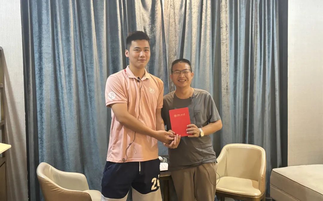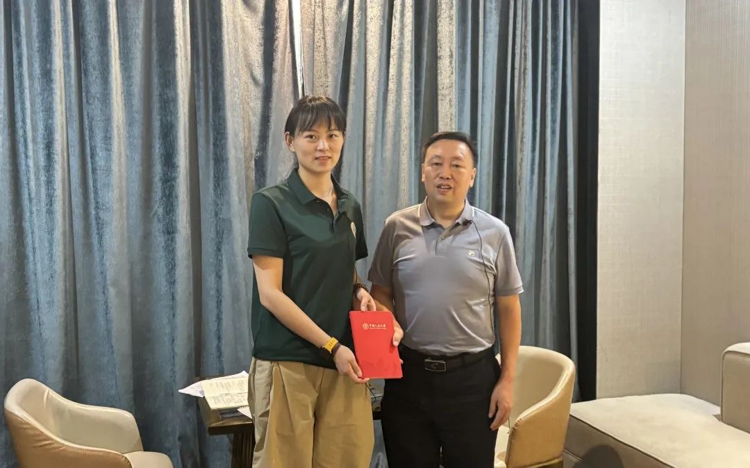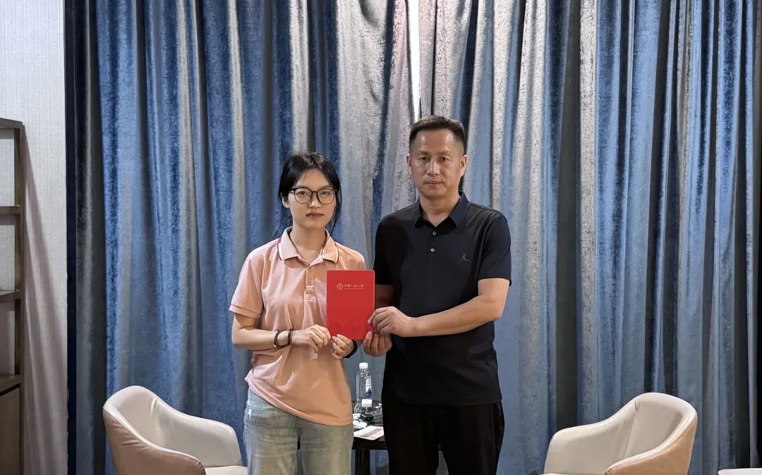 ▲经济与贸易公司硕士生赵怿玮对锦滨镇党委书记张军访谈后赠书留念