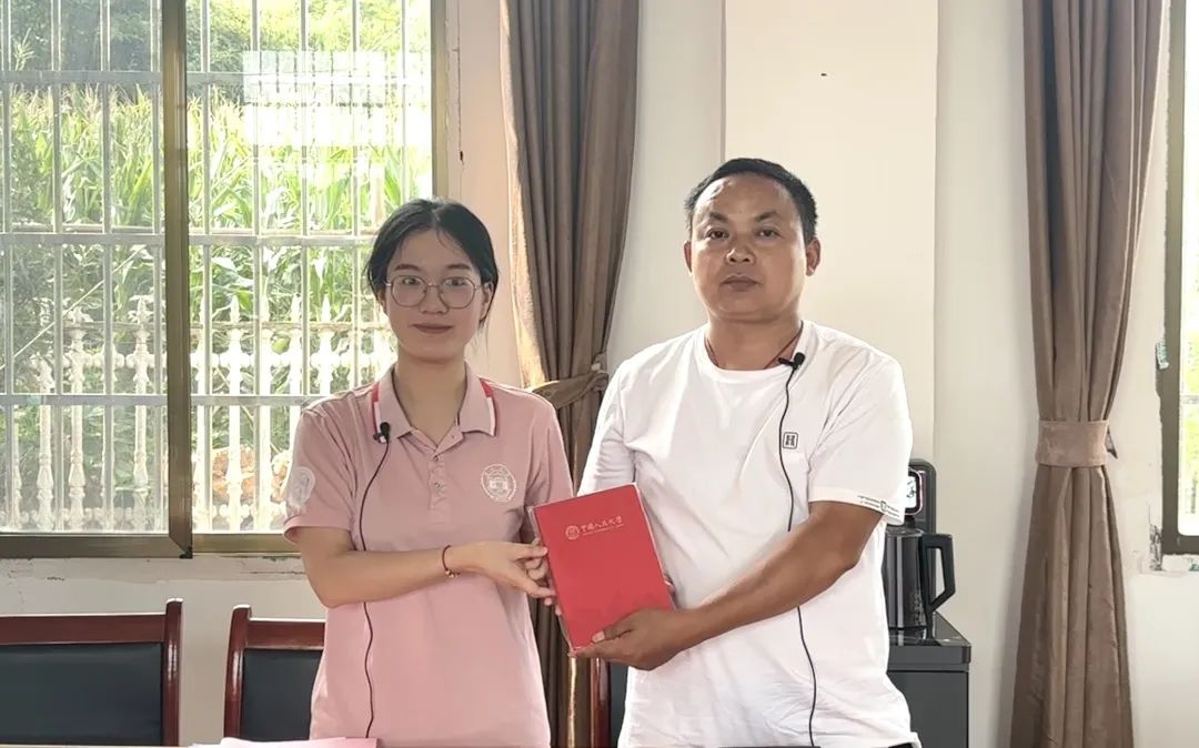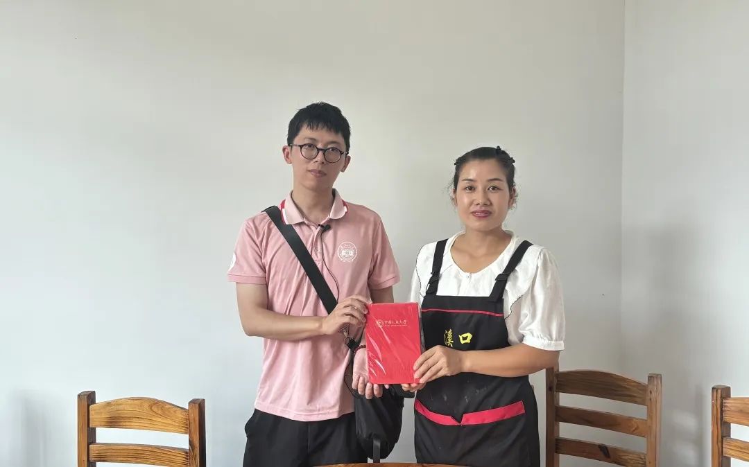 ▲经济与贸易公司硕士生杨芷婕对长坡新村村支书村魏果访谈后赠书留念