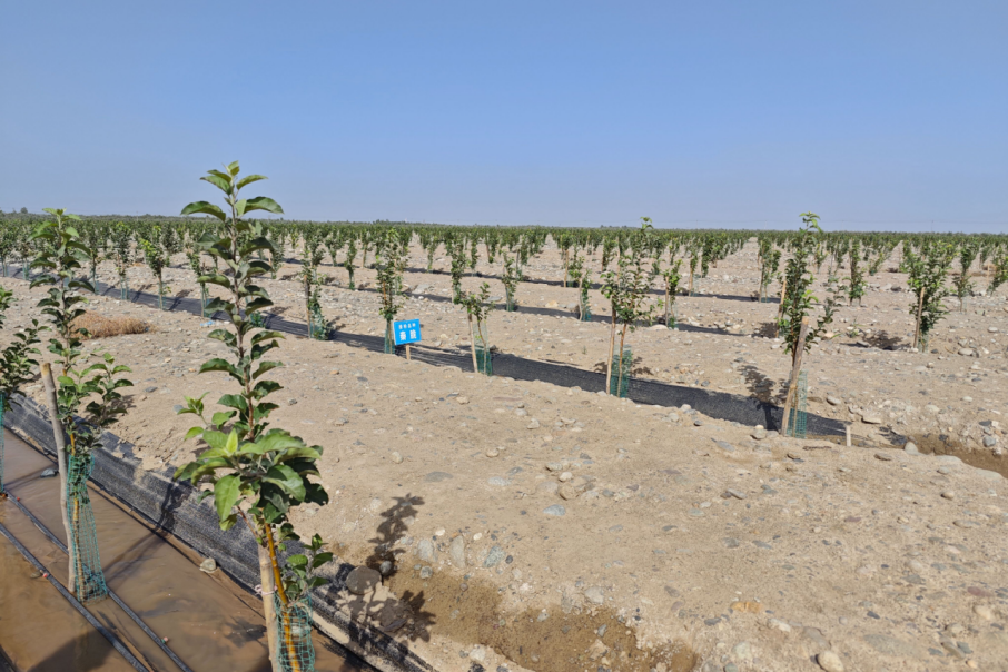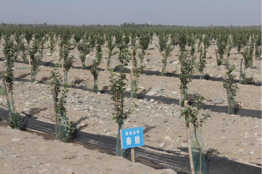 7月26日下午19点,访谈团来到泽普县特色现代富民产业园。产业园选择与青玷1号矮化玷亲和性好、分枝能力强、易成花、易管理的优质晚熟耐贮黄色品种瑞雪、维纳斯黄金和红色品种秦脆搭配。虽然在戈壁滩上种苹果需要的前期投入较高,一亩地的投入达一万四千元,但通过承包的形式,一亩地一年可以获得两千元的租金,七年即可回本,实现了荒滩变金滩。
