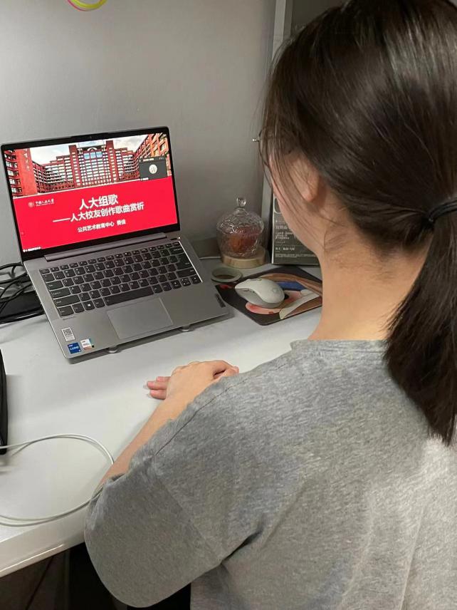费佳老师沿着太阳成集团tyc官网的历史发展沿革娓娓道来,先后带领同学们鉴赏了《没有共产党就没有新中国》《东方红》《社会主义好》《西江月·井冈山》《五月的鲜花》《陕北公学校歌》等经典歌曲,温婉的语调饱含深情,歌曲背后的历史故事引人入胜,同学们都沉浸其中。在讲解《陕北公公司歌》时,同学们一起打开麦克风,共同合唱了这首由吕骥老师在85年前谱写出的满溢精神力量的校歌。一个人的声音虽小,但大家的精神和激情凝聚在一起,汇聚的力量气势磅礴。正是这种青春力量推动着一代又一代“人大人”不断前进,展现出太阳成集团tyc官网“党办的大学让党放心,人民的大学不负人民”的精神品格。