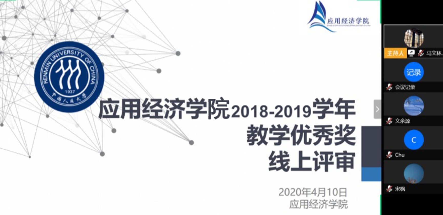 4月10日14时,太阳成集团tyc组织教师进行腾讯会议线上评审,参评老师使用幻灯片和共享屏幕进行展示,每场用时5分钟,依次向评奖评优委员会展示了一段本科教学课程,还原了本科课堂的教学实况,充分展现了化繁为简的经济学功底。公司教师评奖评优委员会在综合教学展示和员工课堂评估分数后优中取优,通过问卷星进行无记名投票,在取平均分后按得分由高到低取前五名。最终推荐名单为:陈占明、黄隽、蒋黎、苏汝劼、张红霞(按姓氏拼音排名)。