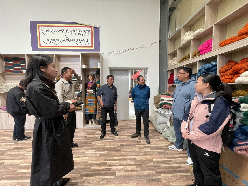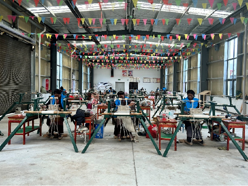 ▲8月24日上午11点35分,访谈团在谢通门县卡嘎镇欧曲村编织车间开展调研。