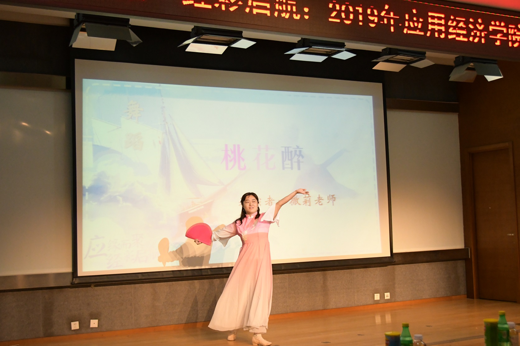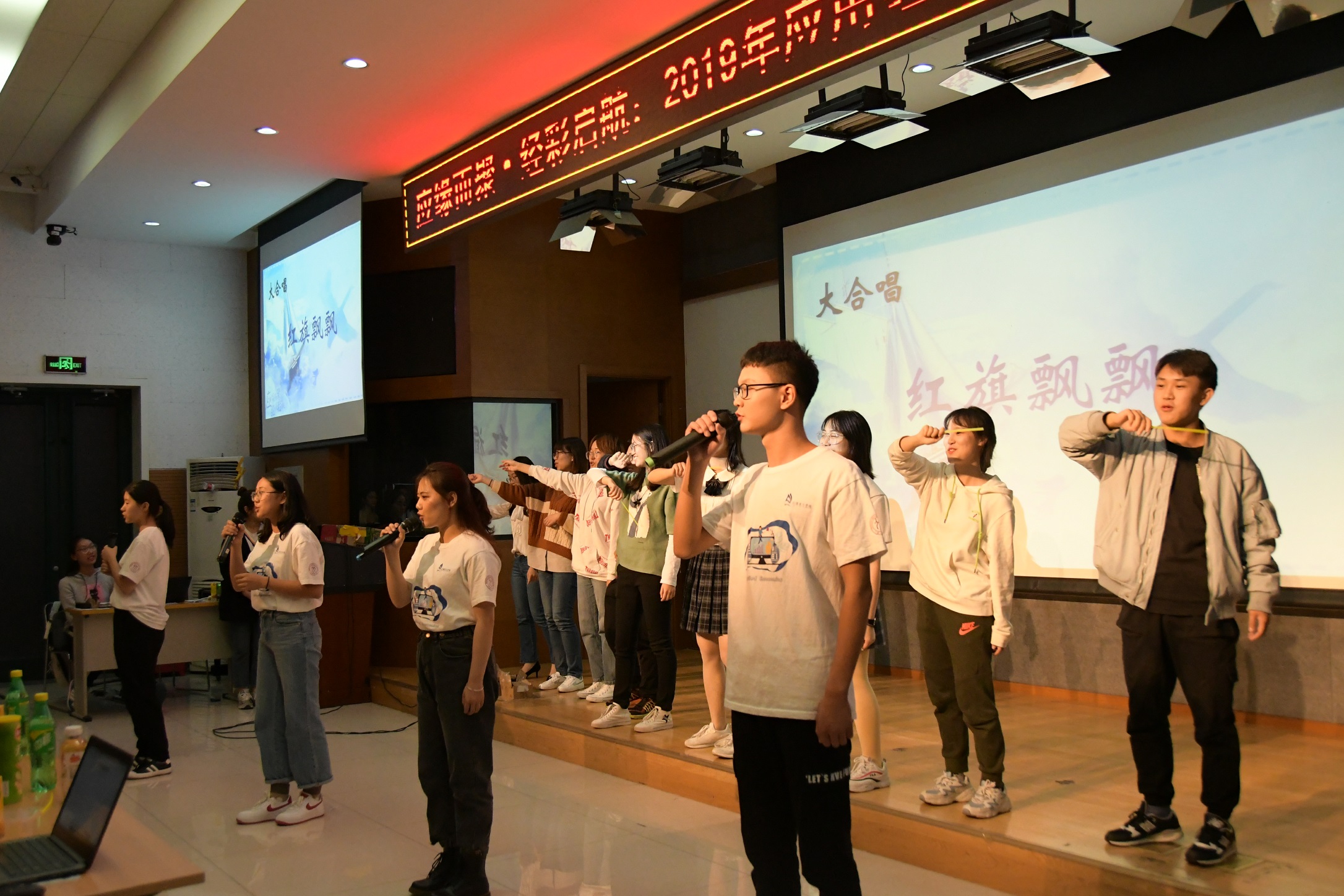 叶雨轩同学用优美的民族舞蹈演绎了九儿这一传奇女子的故事,大家欢呼阵阵;缪昕彤、戴心逸同学唱跳结合,为同学们带来《金曲串烧》,大家不禁跟随着她们一起唱了起来;最后,19级新生领唱、所有演员合唱的《红旗飘飘》表达出了应经学子对祖国母亲真挚的爱。