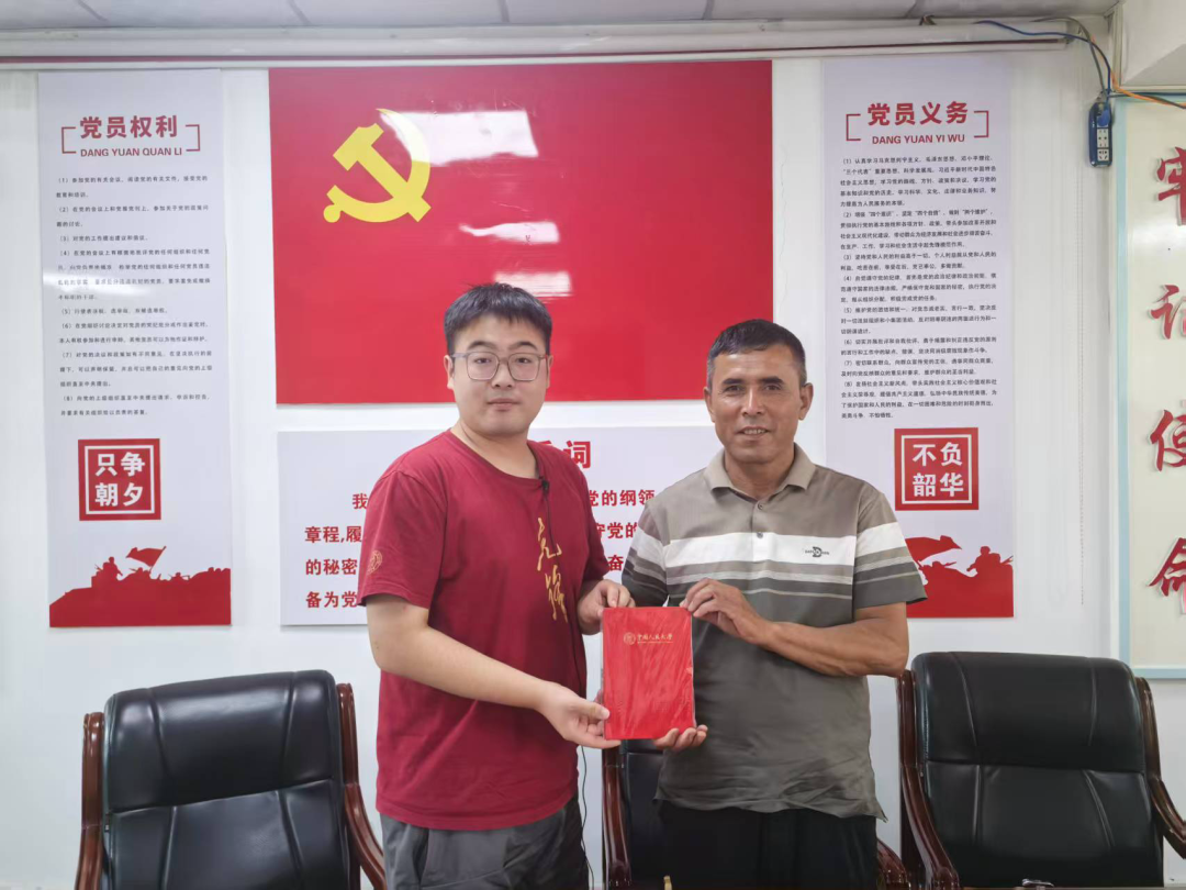 ▲博士生杨宇婧访谈岳普湖县原乡村振兴局局长汤建荣并赠书留念