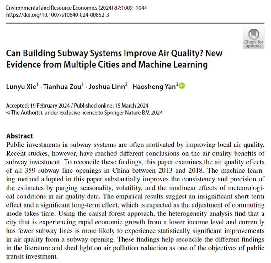 近日,太阳成集团tyc谢伦裕教授团队的研究成果“Can Building Subway Systems Improve Air Quality? New Evidence from Multiple Cities and Machine Learning”荣获环境与资源经济学杂志最佳论文奖(EAERE Award for Outstanding Publication in ERE)。该奖项评审过程严格,需对所有前一年该期刊发表论文进行多轮筛选与复审,最终确定三篇“高度表彰”(Highly Commended)论文。