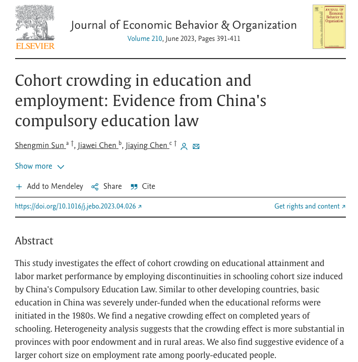 近日,公司助理教授陈佳莹与其合作者的论文“Cohort crowding in education and employment: Evidence from China's compulsory education law”被国际权威期刊Journal of Economic Behavior & Organization接受发表,并在线刊出。(https://doi.org/10.1016/j.jebo.2023.04.026)。陈佳莹为该文的通讯作者。