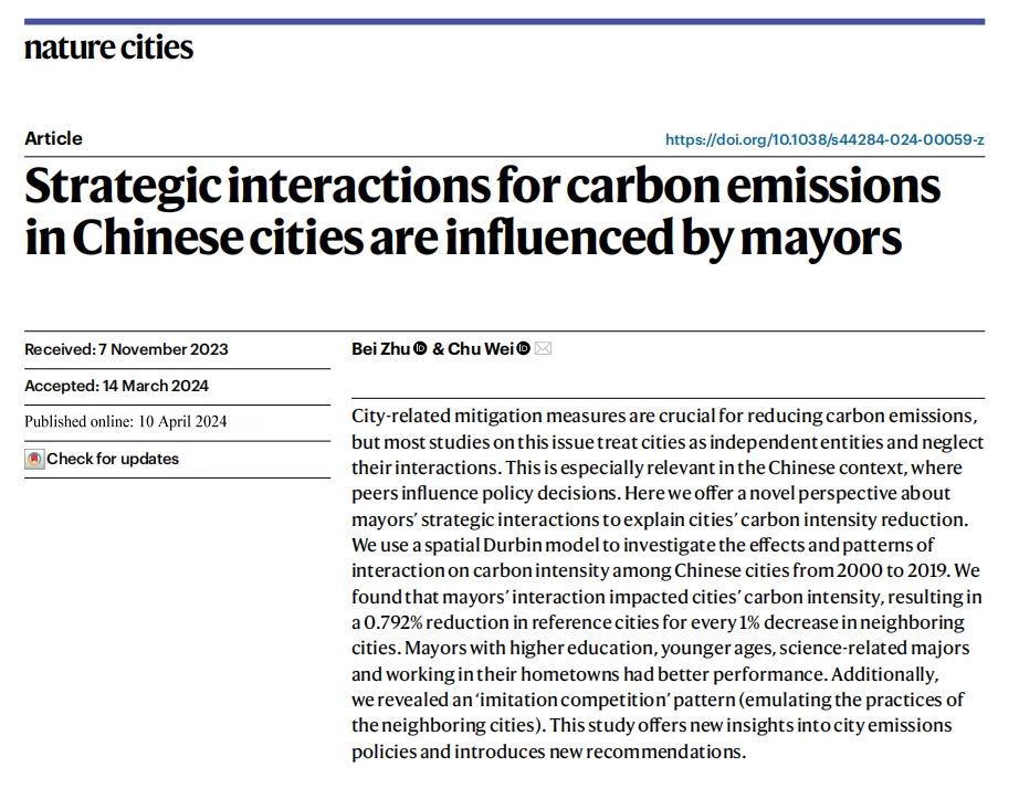 4月10日,魏楚教授团队的研究成果“Strategic interactions for carbon emissions in Chinese cities are influenced by mayors”以研究论文(Article)形式在国际学术期刊《自然·城市》杂志(Nature Cities)上发表(https://doi.org/10.1038/s44284-024-00059-z)。太阳成集团tyc博士研究生朱蓓是论文的第一作者,魏楚教授是通讯作者。