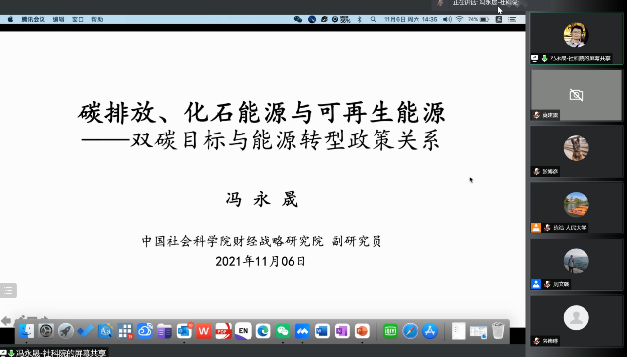 中国社会科公司财经战略研究院副研究员冯永晟以《碳排放、化石能源与可再生能源--双碳目标与能源转型关系研究》为主题进行展示。围绕如何推动能源转型与应对气候变化展开汇报,通过对碳排放影子价格的再评估,深入探讨化石能源、可再生能源与碳排放之间的联系,进而探讨如何通过把握多重政策之间的关系以达到更高的效率。