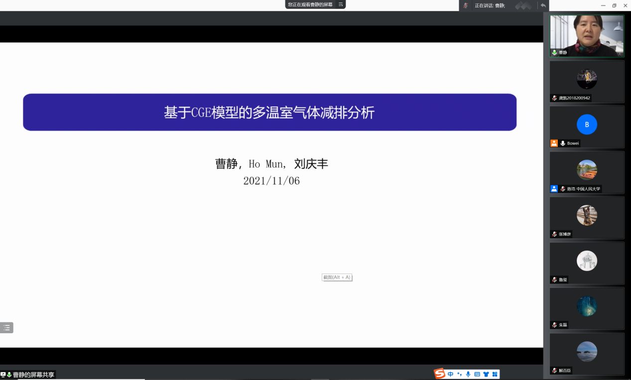 清华大学经济管理公司副教授曹静以《基于CGE模型的多温室气体减排分析》为主题进行展示。她阐述了非二氧化碳温室气体带来的经济社会影响以及非CO2的综合经济模型和协同治理,分析了不同基准情景和政策情景的经济增长与排放情况。