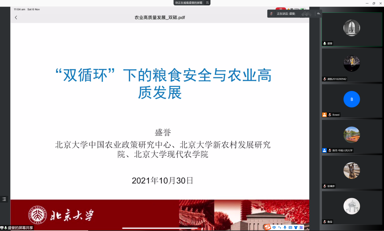北京大学现代农公司副教授盛誉以《双循环下的粮食安全与农业高质发展》为主题进行展示。他从我国农业发展历史和现状、“双循环”下农业发展特征、中长期农业发展对策三个方面分析了双循环下如何保障粮食安全以及如何推进农业高质量发展。