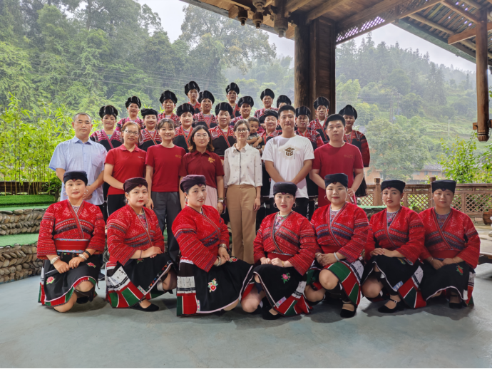▲调研团在龙胜各族自治县龙脊镇金江村黄洛瑶寨中国长发科技馆前合影