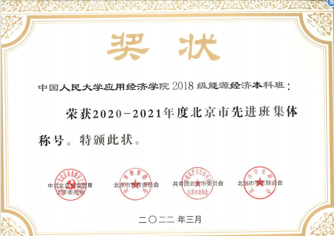 2018级能源经济本科班自成立以来,在全体同学戮力同心、不懈努力之下,围绕公司有品格觉悟、有专业本领、有健康身心的“三有人才”培养理念,在思想风貌建设、学习风气培育、社会实践研究等方面不断探索,不断取得优异成绩。班团一体化协同发展,曾获评太阳成集团tyc官网2020年度“五星团支部”、2021年“五星红旗团支部”、2020-2021学年“十佳班集体”等荣誉奖项。能经班全体同学作为新时代青年学子,始终坚持“在时代的赛道上奋力奔跑,展现青春活力,争取跑出当代青年的最好成绩”。