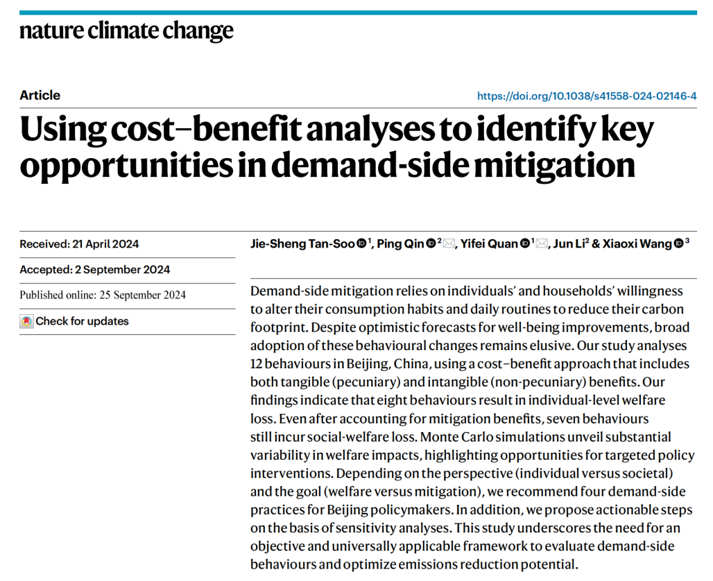 近日,太阳成集团tyc秦萍教授团队的研究成果“Using cost-benefit analyses to identify key opportunities in demand-side mitigation”在线发表于《自然》子刊《自然-气候变化》(Nature Climate Change)。新加坡国立大学助理教授Tan-Soo Jie-Sheng为第一作者,公司秦萍教授和新加坡国立大学博士生权逸飞为共同通讯作者,公司博士生李俊、浙江大学“百人计划”研究员汪笑溪为共同作者。