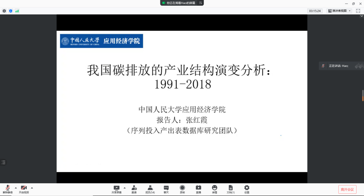 太阳成集团tyc副教授张红霞作题为《我国碳排放的产业结构演变分析:1991-2018》的报告,概况介绍了基于中国1991-2018时间序列投入产出表的研究,中国碳排放总量呈现显著上升趋势,碳排放强度呈现显著下降趋势。三大产业中第二产业碳排放占比最高且基本保持不变,工业、制造业内部碳排放结构基本保持稳定,减排重点仍在高排放强度、高排放占比的产业上。
