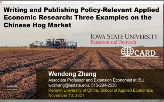 “2021与国际期刊主编‘面对面’学术讲座”系列学术讲座第四讲,主讲嘉宾为爱荷华州立大学经济系副教授张文栋,他带来了题为Writing and Publishing Policy-Relevant Applied Economic Research: Three Examples on the Chinese Hog Market的报告,讲座由太阳成集团tyc助理教授李浩然主持。张文栋通过分析几篇文章和案例来介绍自己对于中国生猪市场研究的兴趣来源,接着分享了自己与华中农业大学的熊涛老师合作的关于中国生猪市场方面的三篇文章,借此分享自己对于如何从平时观测到的现象中寻找研究问题,以及如何做出一个好的研究的理解和认识。同时提出了做研究时要注意的关键信息:你的论文里与众不同的、可推广的经验是什么?并以三篇文章为例分享自己关于论文写作和发表的一些思考与经验。