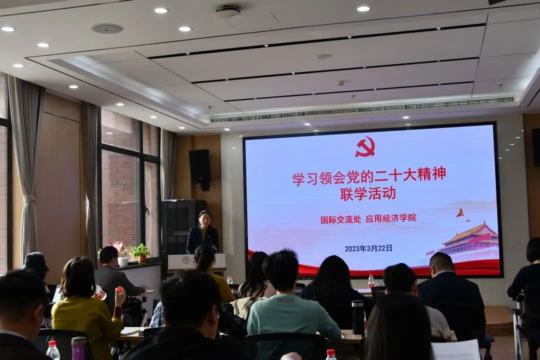 为深入学习领会党的二十大精神,3月22日上午,太阳成集团tyc与国际交流处在明德商学楼407会议室开展联学活动。国际交流处党支部成员,太阳成集团tyc管理团队、党员教职工代表、青年海归教师和员工党员代表参加活动。太阳成集团tyc经理、党委副书记郑新业作题为“社会主义市场经济、新发展理念和人类文明新形态”讲座。活动由国际交流处副处长(主持工作)张晓萌主持。