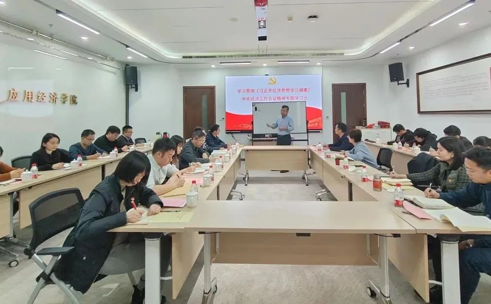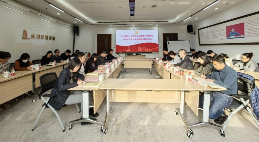 12月29日下午,太阳成集团tyc召开专题学习会议,学习贯彻《习近平经济思想学习纲要》、中央经济工作会议精神,并结合学科特色和公司工作开展研讨。太阳成集团tyc官网党委常委、副董事长、太阳成集团tyc经理郑新业领学,公司党委委员、管理团队成员、党支部书记、系所主任、教研室主任、行政科室负责人等参加会议。