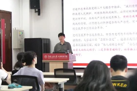为推动理论学习走深走实,团支部邀请公司延河讲师团讲师、马克思主义公司博士生朱恵羽作“自我革命:中国共产党跳出历史周期率的第二个答案”主题宣讲。朱恵羽从乡长董会祯如何获得人民拥护的案例出发,结合习近平总书记系列重要讲话精神和党的十八大以来取得的反腐败斗争重大成果,讲述了中国共产党跳出历史周期率的伟大实践经验。同学们全神贯注,认真聆听,静心思考,对习近平新时代中国特色社会主义思想有了更为深刻的认识。