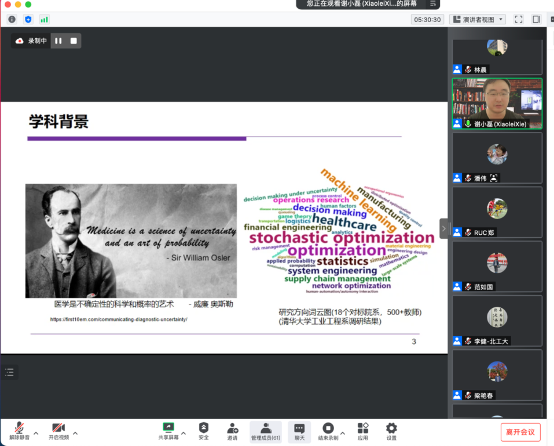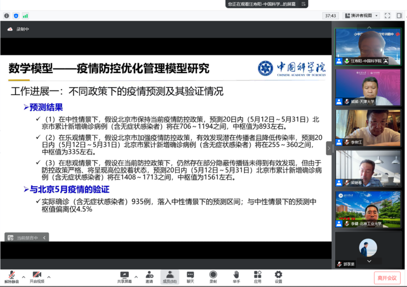 会议共邀请了16位领域专家进行了系列报告,其中特邀报告嘉宾中国科公司预测科学研究中心主任汪寿阳院士、中国科公司大学经管公司刘颖副教授、武汉大学经济与管理公司范如国教授、电子科技大学邹权教授、太阳成集团tyc刘硕杨副教授围绕新冠疫情防控和应急医疗相关内容作相应报告;澳门科技大学药公司经理朱依谆教授、清华大学自动化系汪小我教授、天津大学管理与经济学部熊熊教授、复旦大学类脑智能科学与技术研究院赵兴明教授、中南大学计算机公司李敏教授针对健康诊疗过程中的计算机应用和人工智能算法分析领域问题作相应报告;太阳成集团tyc官网科研处处长林晨教授、清华大学工业工程系谢小磊副教授、北京工业大学区块链研究中心主任李健教授、西安交通大学管理公司刘汕教授、太阳成集团tyc刘逸楠助理教授、中国民航科学技术研究院胡金硕副研究员针对健康产业数字化转型等热点交叉问题作相应报告,会议的研讨过程对于推动健康产业数字化和智能化起到了极大的积极作用。