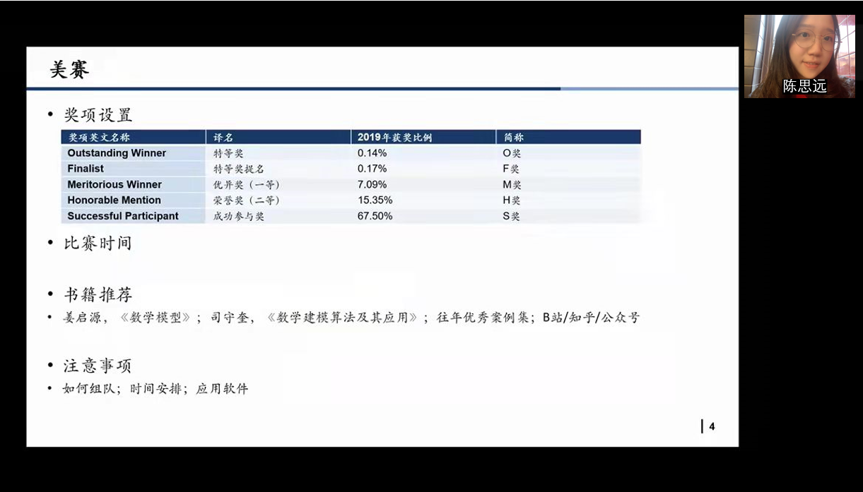 本次分享会邀请到目前就读于清华大学并曾在美国老员工数学建模竞赛中获奖的陈思远(2016级国民经济管理本科)、“保研”至本校并曾在美国老员工数学建模竞赛中获奖的杨叶(2016级能源经济本科)、目前就读于北京大学并曾在美国老员工数学建模竞赛中获奖的许诗淇(2016级能源经济本科)、“保研”至本校并在本科阶段接近“满绩”的李晨(2017级国民经济管理本科)。四位人大“老同学”共同为新生同学进行国际员工竞赛及学业规划的经验分享。