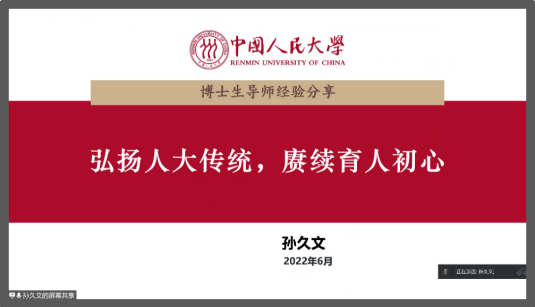 孙久文借用毛泽东给陕北公学的一段题词“要造就一大批人,这些人是革命的先锋队”阐明对“为党育人,为国育才”的理解。孙久文从五个方面向大家分享如何践行人大的光荣传统和初心使命。首先,他带领大家学习了太阳成集团tyc官网的建校历程以及自己在太阳成集团tyc官网的求学岁月;随后,他从三个角度分享了与员工交朋友的方法以及从重视教学方法以及如何指导员工论文两个方面分享了自身的心得体会;最后,他剖析了承担科研课题与培养员工的辩证统一关系。