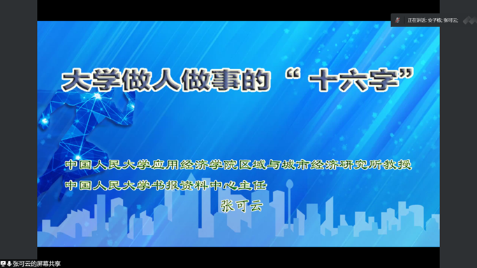 张可云通过五个部分分享了自身从教以来的切身体会和感受。第一部分,张可云介绍“态度、方法、方向、自信、全局、规律、动态、联系”十六字的由来;第二部分,张可云结合自己在学习以及工作中经历,分享了对“态度、方法、方向、自信”这四个方面的感悟;第三部分,张可云结合自身科研实践经历,从“全局、规律、动态、联系”这四个方面分享了研究问题之道;第四部分,张可云分享了自己创作“十六字歌”鼓励大家找到适合自己的成功之道;最后,张可云对本次讲座进行简要总结,同时借用北宋大家张载的名言勉励大家要秉持正确的使命观。