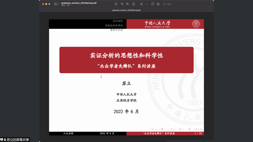 首先,苏立简要地介绍了上世纪八十年代以来经济学实证分析研究范式的确立过程,以及实证研究范式的内涵;接着,苏立从马克思认识论基本原理以及经济社会运行基本规律的角度切入,分析了经济学实证研究所蕴含的思想性和科学性;随后,苏立通过案例分析法介绍了面板数据因果推断的本质,并重点讲解了双重差分模型(DID)、倾向得分匹配(PSM)、倾向得分匹配法的双重差分法(PSM-DID)以及交错双重差分模型的匹配原理与应用场景;最后,苏立对本次讲座内容总结道:在科研工作中既要善于将马克思主义认识论与实践相结合,也要科学地运用计量经济学方法,还要在研究中坚持 “四个自信”,只有这样,才能充分阐释中国经济发展的成功经验与独特规律。
