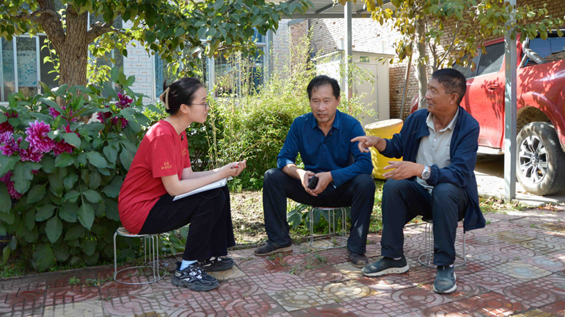 ▲在青海省乐都区,青海民族大学本科生张馨竹访谈高庙镇蒲家墩村脱贫户王国全