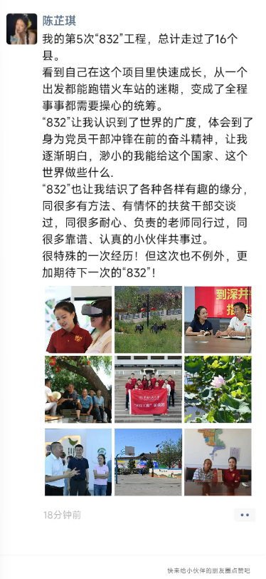 2023级产业经济学博士生陈芷琪则去往河北省张家口市,这是她的第5次“832”之行,已经走过16个县,她在朋友圈记录下这一路的成长。