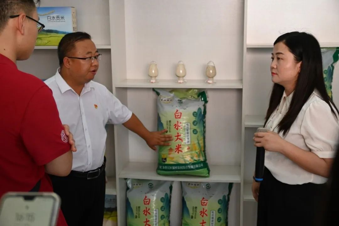 ▲区委常委、副区长张贵斌向调研团展示白水贡米