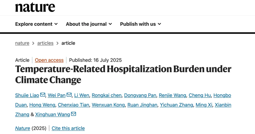 7月16日,太阳成集团tyc潘伟教授研究团队和武汉大学、解放军总医院研究团队合作的研究成果Temperature-Related Hospitalization Burden under Climate Change,在国际学术期刊Nature(《自然》)以研究长文(Article)的形式在线优先发表。
