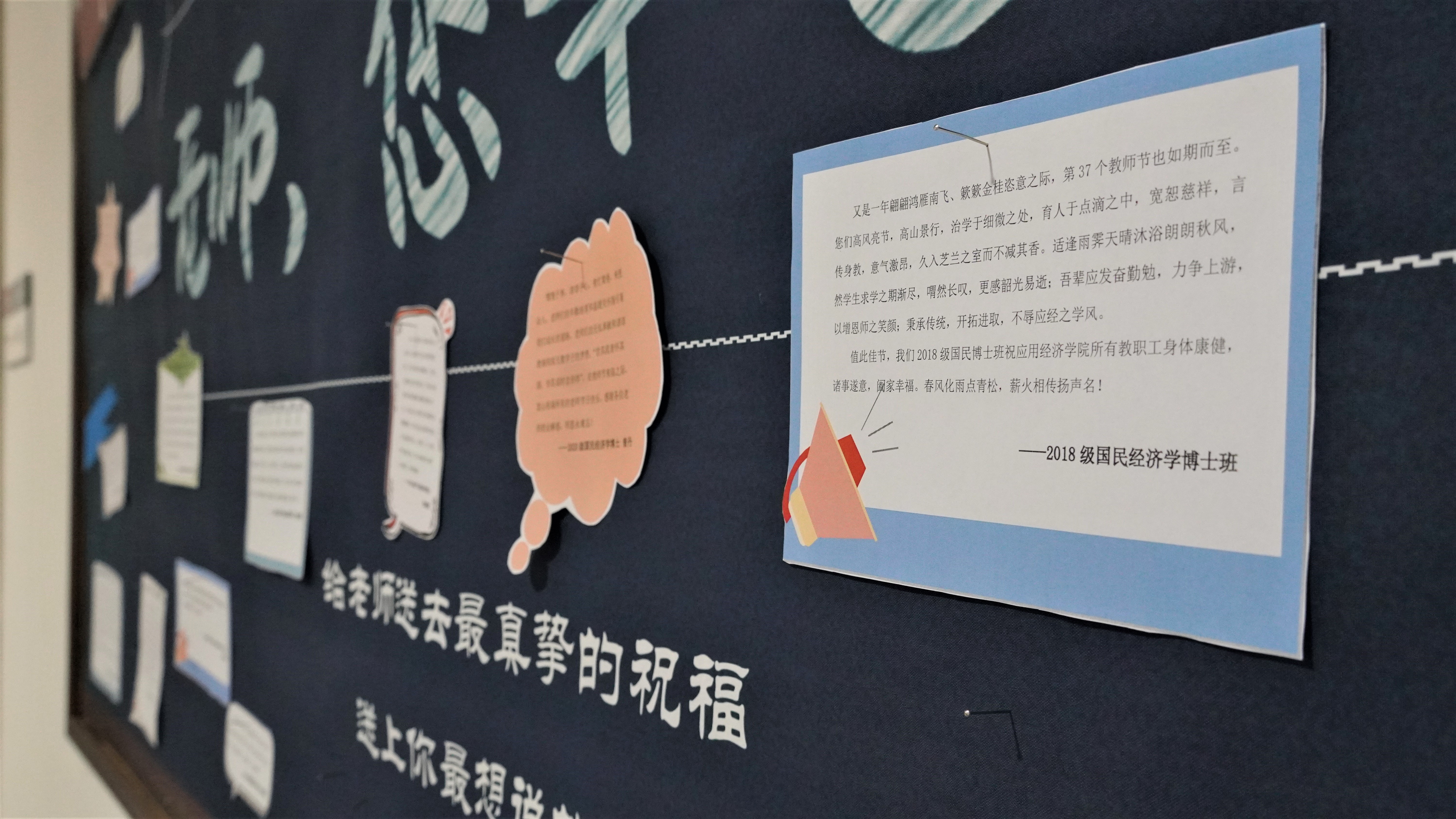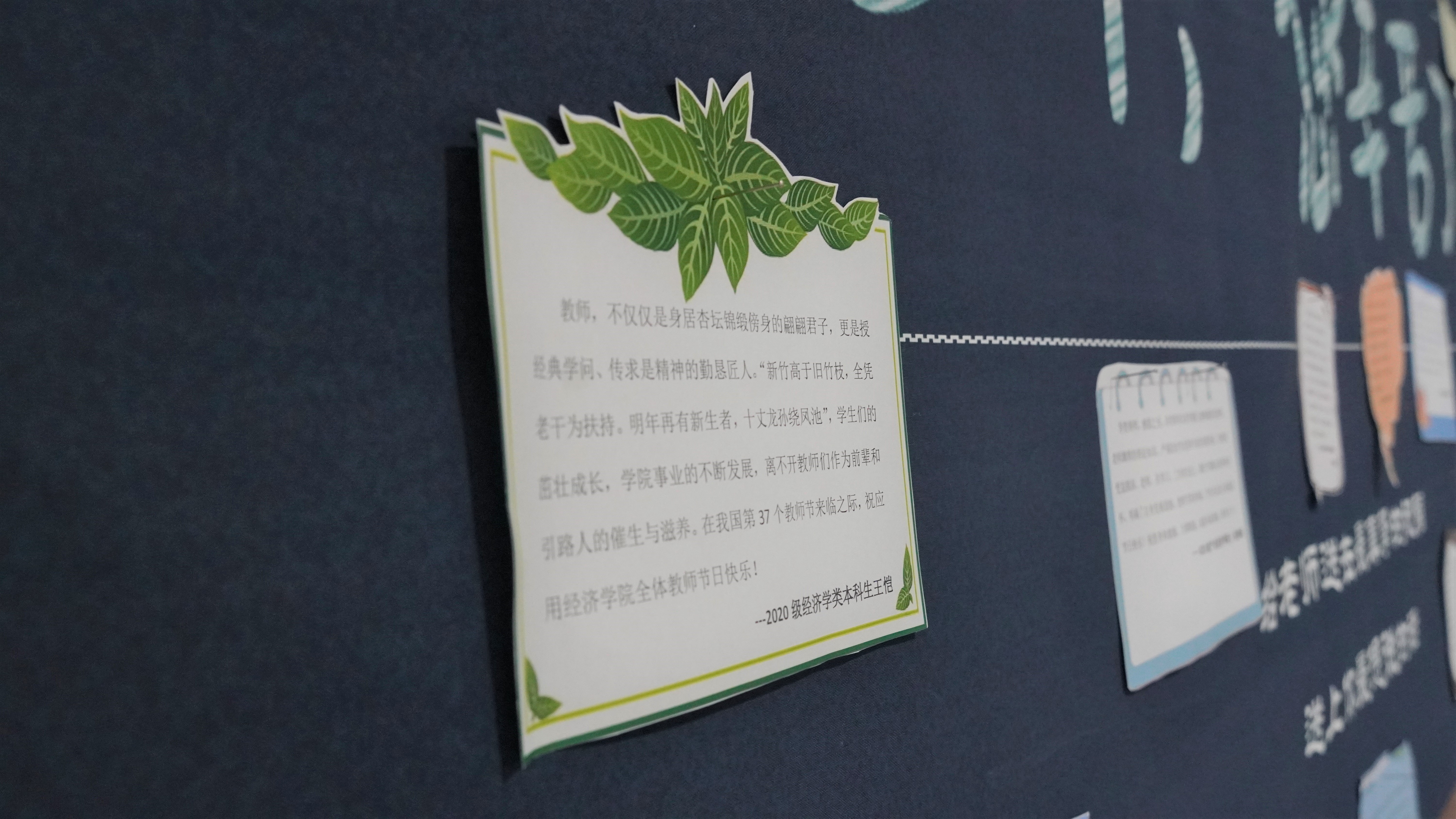 又是一年翩翩鸿雁南飞、簌簌金桂恣意之际,第37个教师节也如期而至。您们高风亮节,高山景行,治学于细微之处,育人于点滴之中,宽恕慈祥,言传身教,意气激昂,久入芝兰之室而不减其香。适逢雨霁天晴沐浴朗朗秋风,然员工求学之期渐尽,喟然长叹,更感韶光易逝;吾辈应发奋勤勉,力争上游,以增恩师之笑颜;秉承传统,开拓进取,不辱应经之学风。