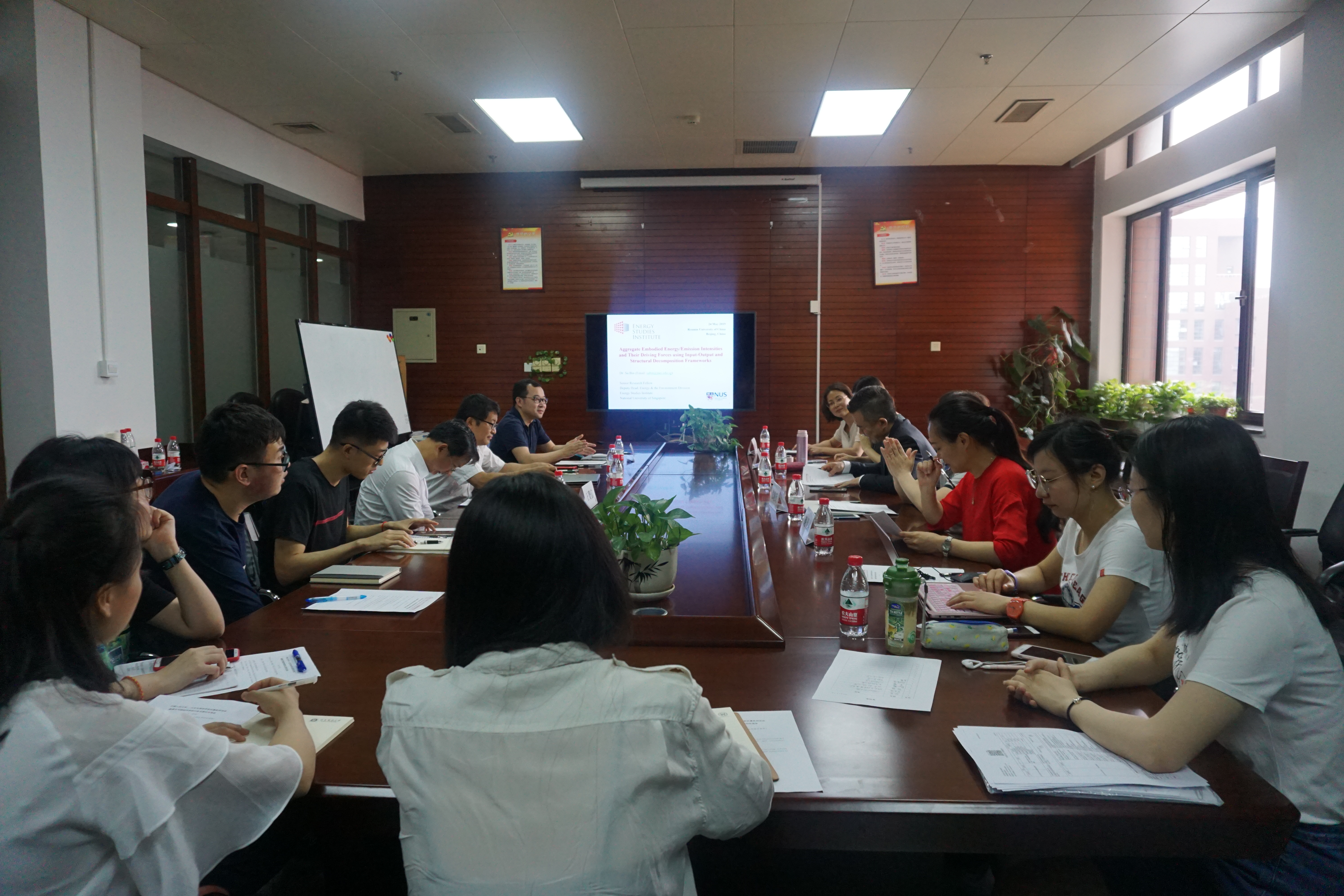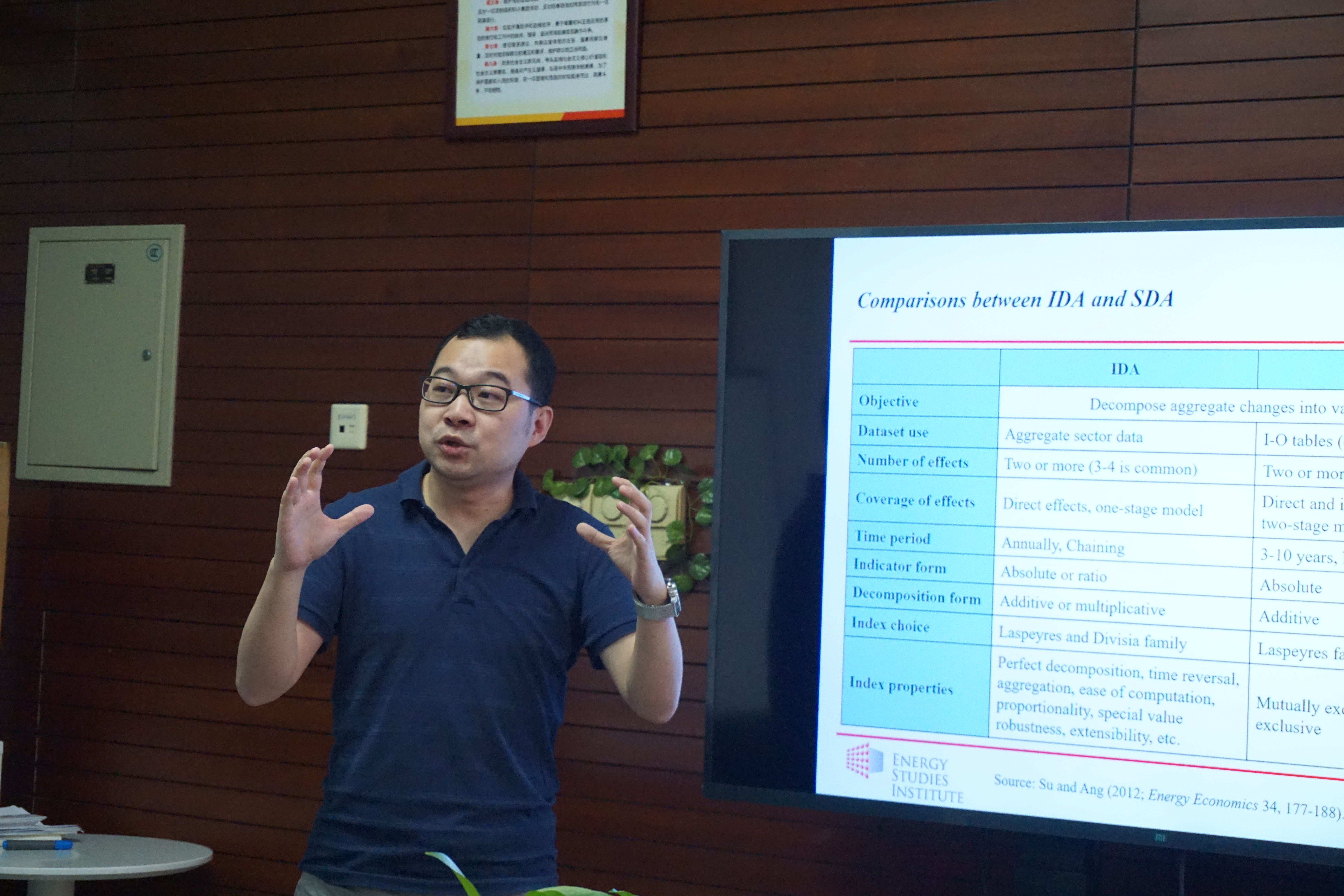 随后,新加坡国立大学苏斌高级研究员以“Aggregate Embodied Energy/Emission Intensities and Their Driving Forces using Input-Output and Structural Decomposition Frameworks”为题进行学术报告,他认为,国际气候变化与能源强度息息相关,传统关于能源强度的研究大多仅停留在生产端,但仅在生产端进行控制是不够的,因此,他提出从需求端进行Aggregate Embodied Energy/Emission Intensities(AEI)的测算。运用input–output (I–O) framework和multiplicative structural decomposition analysis (SDA),将AEI的测算分为总量层面、需求层面和分行业层面,每两层之间都存在相互关系,不同层面之间可以通过SDA进行计算,计算完底层AEI就可以通过层与层之间的关系计算出上层的AEI。结果发现,从中国来看,政府投资行为、城镇居民的消费行为、区域间的相互作用等都会对AEI产生不同权重的影响。作者构建的框架可适用于其他AEI测算,并可推广到多国/多区域。