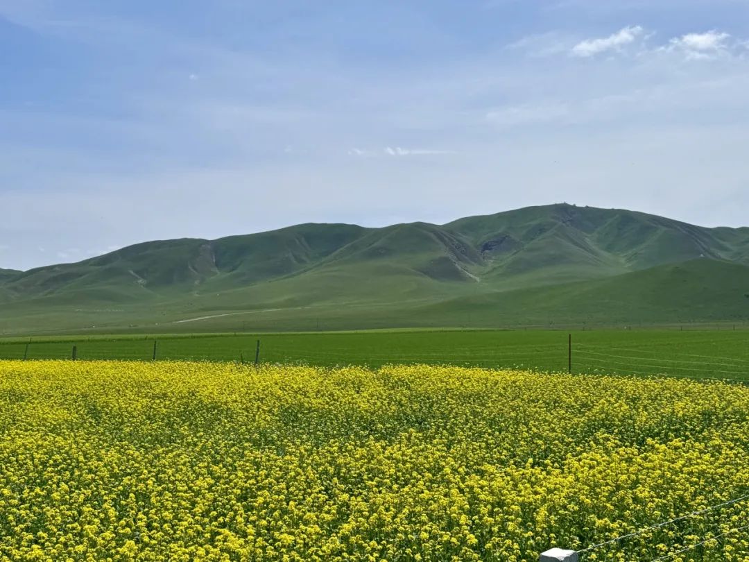 ▲海晏县达玉五谷村前的油菜花和牧场