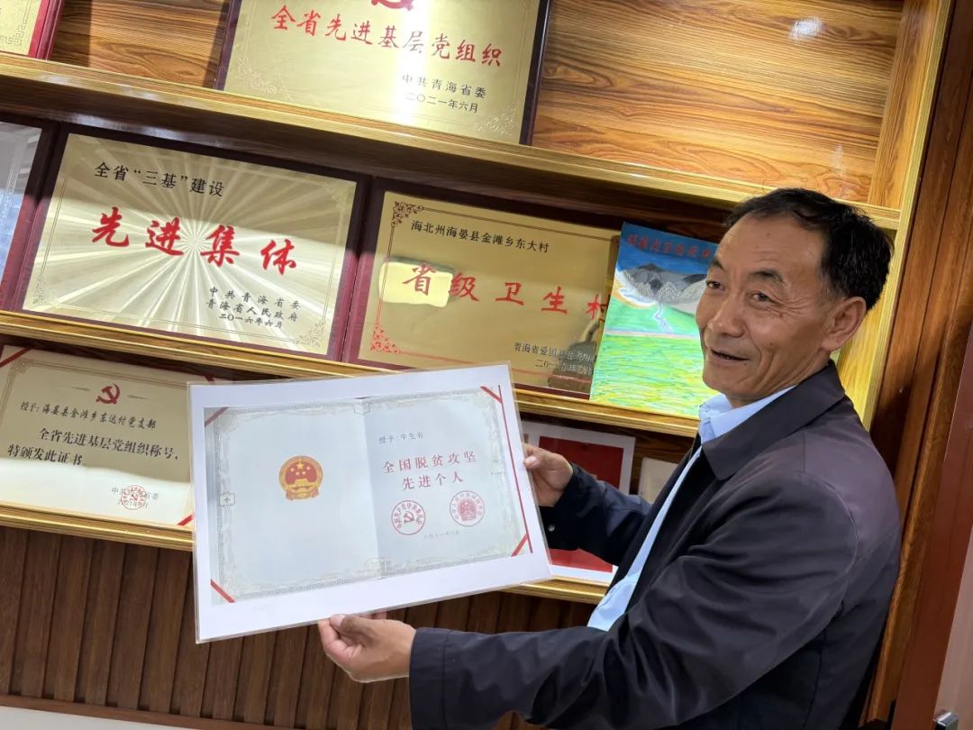 ▲东达村支书牛生有向访谈团展示其全国脱贫攻坚先进个人奖状
