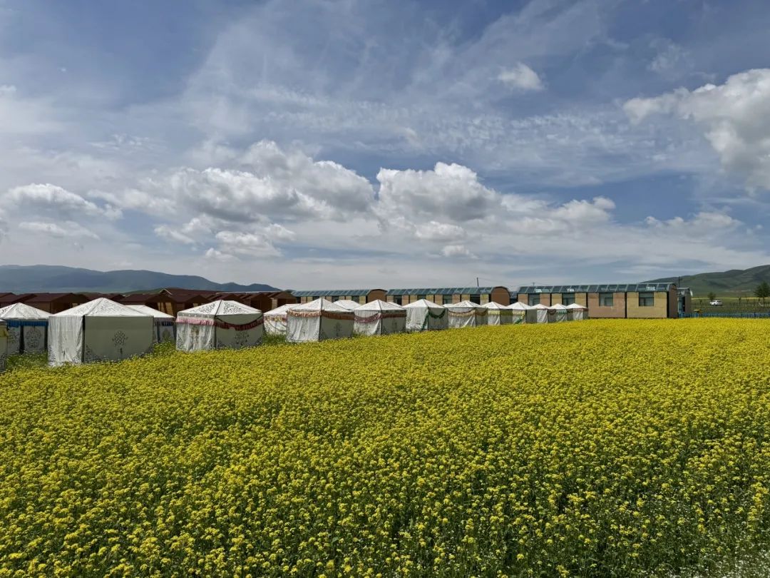 7月16日中午,访谈团前往海晏县达玉五谷村。达玉五谷村依托二二一基地原子城(两弹一星研发地)打造了2A级旅游景区西海星墅,其定位为复合型生态旅游目的地,从西宁市前往景区的游客中途可在此处游览住宿,旺季入住率可达90%。景区基于"畜牧+企业+旅游"发展模式建设,包含星空主题民宿集群、自驾车营地、木屋度假区等设施,配套生态停车场、木栈道等基础设施。其特殊地理环境形成了草原、沙漠、湖水与高山共存的自然景观,东靠原子城纪念馆,西邻青海湖,已纳入环湖北岸精品旅游线路体系。