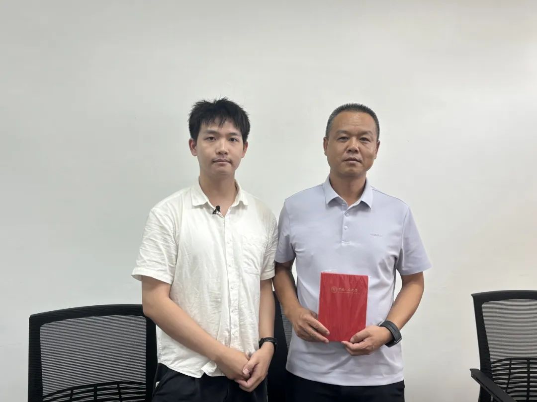 ▲湖南大学经济与贸易公司硕士生贾宝成对凉水井镇党委书记谭顺环访谈后赠书留念
