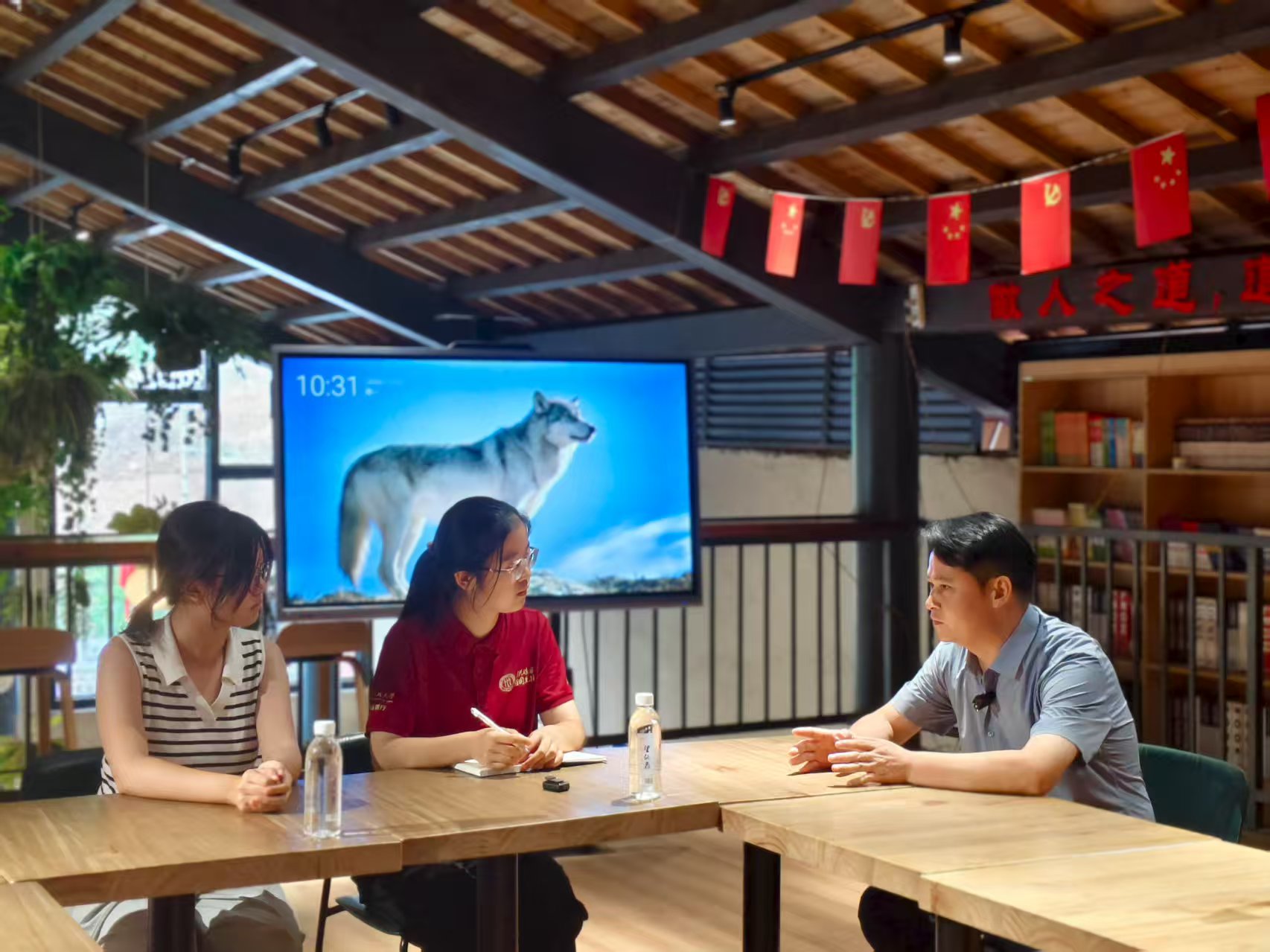 ▲太阳成集团tyc本科生李宜芳、新闻公司本科生熊奕辰访谈华坛山镇党委副书记、镇长郑以勤