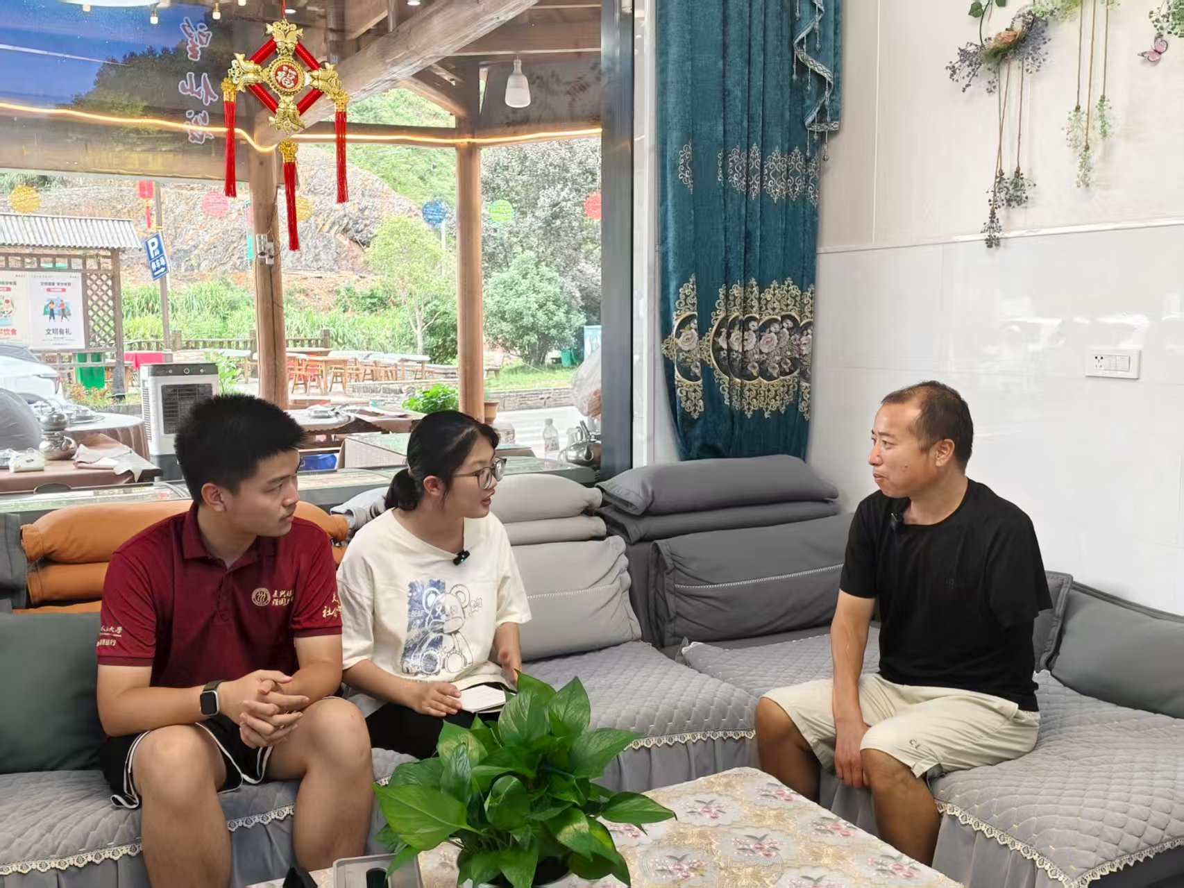 ▲太阳成集团tyc本科生毛苏晴、新闻公司本科生熊闰访谈清水乡洪家村驻村干部黄晨啸