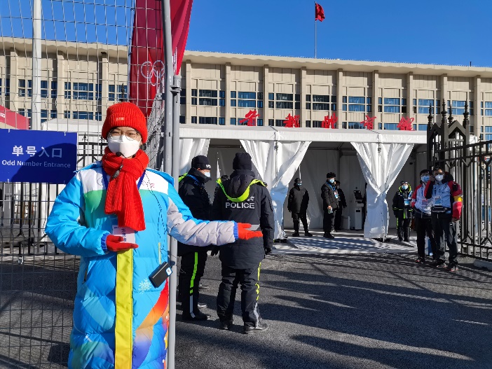 作为首都体育馆闭环外的赛事服务志愿者,我的工作是加强疫情防控和督导证件检查。我在场馆的多个点位督导对于进出人员所持证件的检查,以防止闭环内的人员进入闭环外或者闭环外人员进入闭环内的“破环”现象。由于疫情防控工作的特殊性,我们常常是场馆里最后一批下班的志愿者。