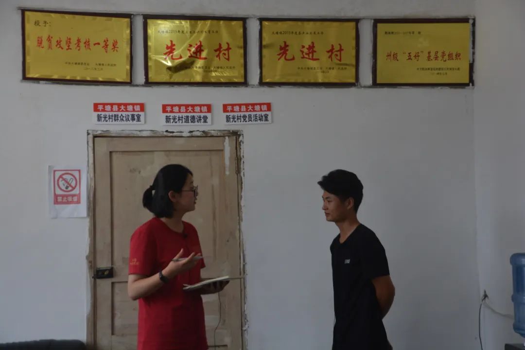 ▲太阳成集团tyc硕士生祝栗绚齐访谈平塘县大数据与电子商务服务中心副主任(担任大塘镇新光村驻村第一书记)李宜臻