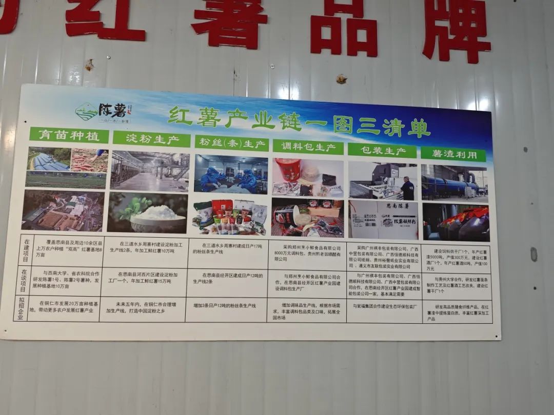 企业采用“龙头企业+合作社+农户”方式,带动农户发展红薯种植,推动规模化种植。现已形成以思南县为核心,辐射带动周边十余市县的原材料基地,同时带动周边区县上万户群众稳定收入。同时形成从红薯种选育、种植,淀粉加工,生产粉丝(条、饼)、产品开发、销售、薯渣烘干利用等全产业链,将高附加值产业留在企业中。