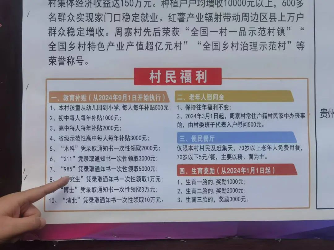 陈薯酸辣粉为周寨村提供多种福利。董事长张诚自2012年起,每年为周寨村、新民村老人发放春节慰问金;成立了“张诚奖学金”“张诚助学金”,为三道水乡教育捐款捐物达300多万元;为扩建周寨村公路、新建村委会办公楼等捐资。同时陈薯酸辣粉为当地的妇女残疾人等群体提供就业岗位,真正实现就近就业,让整个周寨村都能从企业发展中受益。
