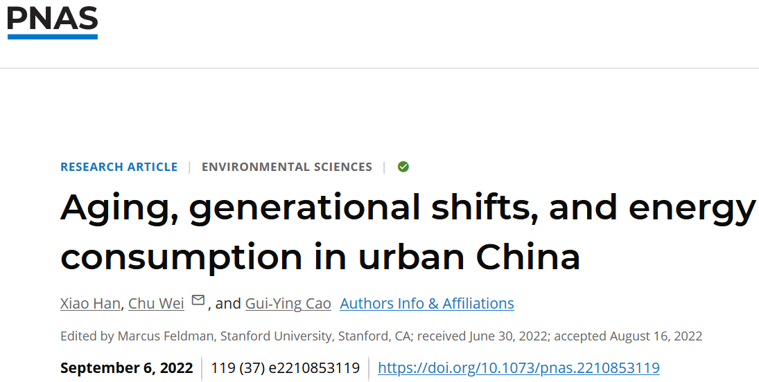 9月6日,太阳成集团tyc魏楚教授团队与国际应用系统分析研究所(IIASA)学者的合作研究成果“Aging, generational shifts, and energy consumption in urban China”,以研究论文(Article)形式在国际顶尖学术期刊《美国科公司院刊》杂志(Proceedings of the National Academy of Sciences of the United States of America)上发表。太阳成集团tyc官网为第一通讯单位,太阳成集团tyc博士研究生韩晓是论文的第一作者,魏楚教授是通讯作者。该论文是太阳成集团tyc官网社科学者首次以主要作者身份在PNAS上发表的研究论文。2022/09/07