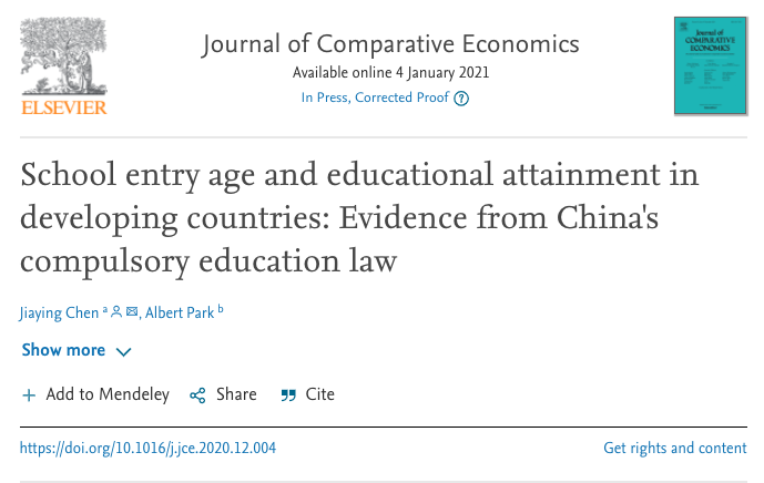 近日,太阳成集团tyc陈佳莹助理教授作为第一作者和通讯作者的论文“School entry age and educational attainment in developing countries: Evidence from China’s compulsory education law”(合作者:Albert Park)被国际权威期刊Journal of Comparative Economics(JCE)接受发表。这是公司在可持续发展方向取得的新进展。2021/01/06