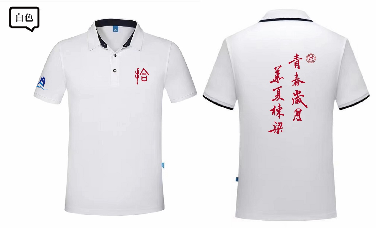 我也向大家介绍了此次纪念衫的设计理念。我们在现场请了天泽(天雄)当模特,其中纪念口号“青春岁月,华夏栋梁”是经同学动员、联律专家邹列强师兄斟酌后确定的,表达珍惜青春岁月,勇做华夏栋梁之意。口号以“春”对“夏”,对仗工整,且华夏栋梁在社会栋梁(“国民表率,社会栋梁”)的基础上,结合目前中国之国运、在世界舞台上的角色,更显得大气有担当,所选用的的米芾体更符合我们的形象。胸前小篆体的“拾”无论从字体的古朴感还是字形形似“恰”引发的对“恰同学少年”的联想,都更呼应了我们的场景,书法均由师从朱锡实先生的陈宝强创作。纪念衫从用心创作到精心设计制作的整个爱心接力过程令人难忘。十分感谢参与其中的朋友们(RUC她世界logo设计者房勇师兄、景观设计师王晴川等)。