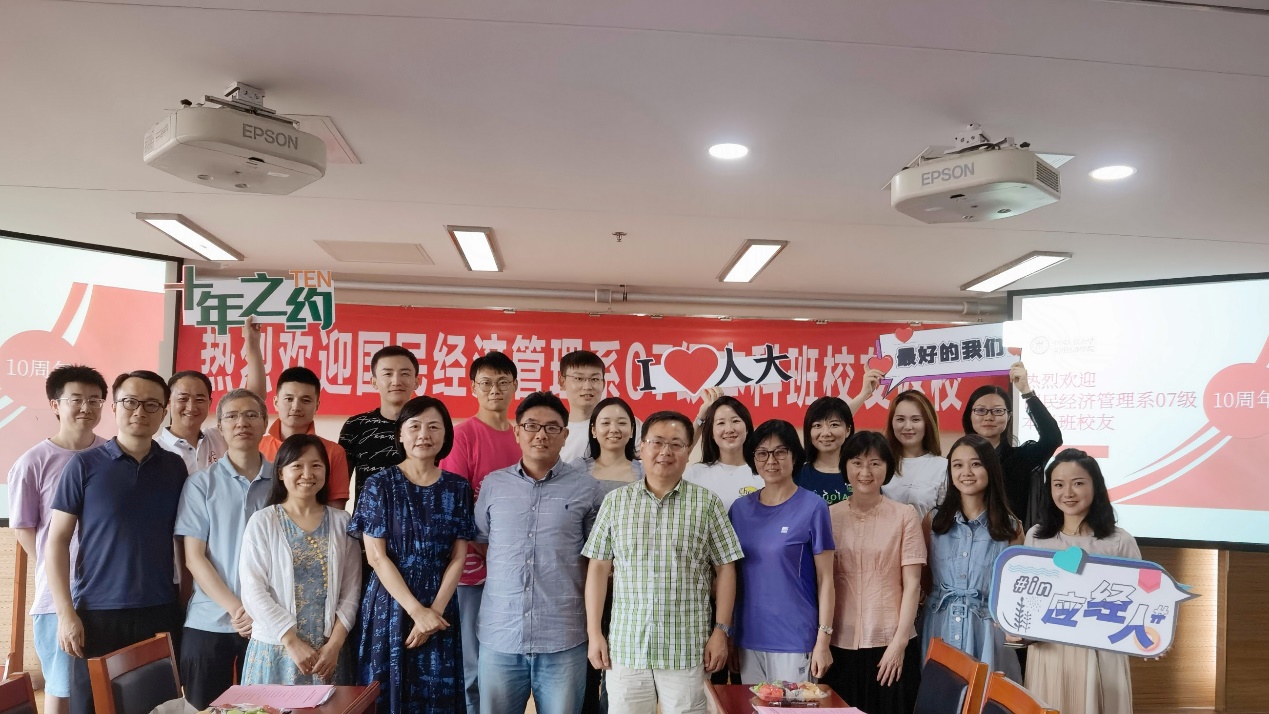正式相聚的这天,从西门刷身份证人脸识别入校,在明德主楼A1口看到熟悉的名单出现在保安桌子上,一股暖流升腾在心间。一路走进依旧熟悉的明主728,公司特意为我们布置的聚会现场就这样映在了心里,也印在了心里。“热烈欢迎国民经济管理系07级本科班员工返校”横幅大气,布置温馨,礼物周到,心中涌起的,是我们满满的感动。感谢王明月老师的精心准备。